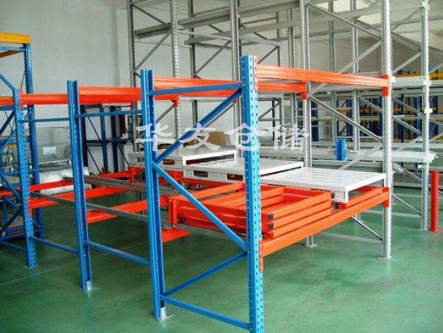 壓入式貨架是在前后梁之間以多層臺(tái)車重疊相接,從外側(cè)將托盤(或料箱)置入臺(tái)車推入,后儲(chǔ)存之貨物會(huì)將原先的貨物推向里面。臺(tái)車跨于傾斜軌道上,當(dāng)外側(cè)貨物被取走時(shí),里面的會(huì)自動(dòng)滑下。