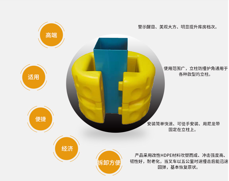 功能介紹:立柱防撞護套是專門為保護鋼平臺立柱以及建筑物支撐柱而設(shè)計的,采用改性LDPE材料吹塑而成,中空結(jié)構(gòu),雙層保護。當立柱受到叉車等 設(shè)備撞擊時,能量被護套緩沖吸收,不僅保護了立柱,也保護了搬運設(shè)備。